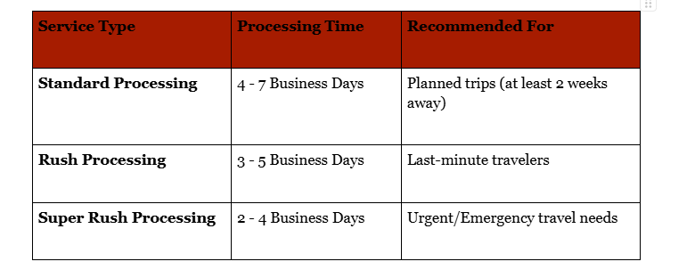 The time it takes to receive your visa depends on how quickly you need it. Below is a breakdown of the typical processing windows: