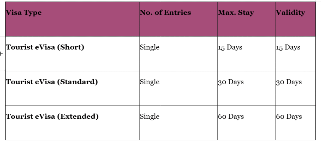 When applying for your travel permit, you must select the category that matches your planned length of stay. All eVisas for tourists are currently issued for single entry only.